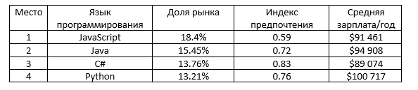 Как видно из показателей, что разработчики предпочитают использовать в своих проектах языки программирования Python и C#, но при этом зарплата разработчика на Python самая высокая.